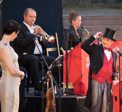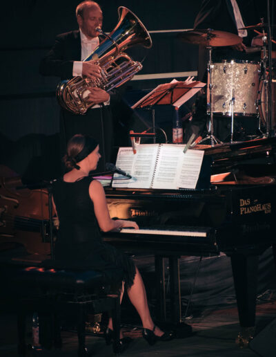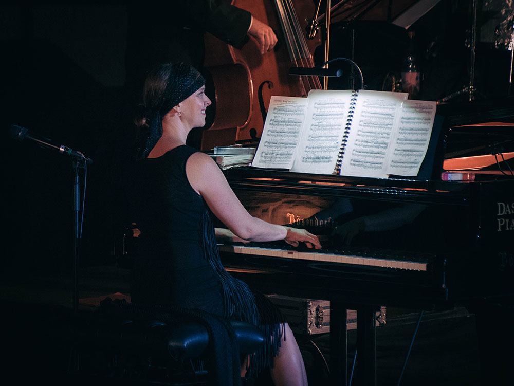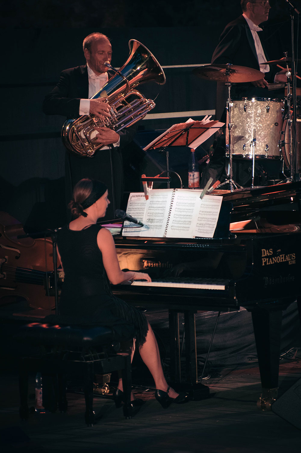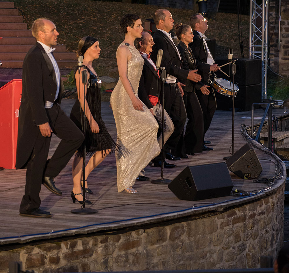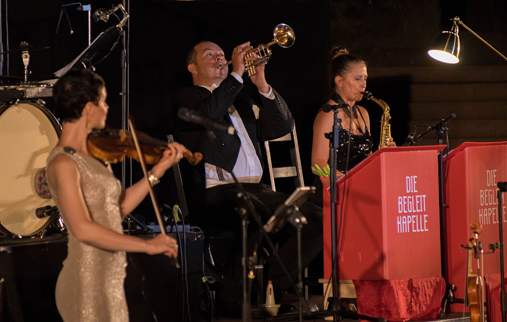 Ein sechsköpfiges Salonorchester mit Klavier, Bass, Schlagzeug, Geige, Saxofon und Trompete spielt die alten Schlager durchaus in neuer Frische. Für die sorgte vor allem Geigerin Lisa Hansen als Blickfang mit langen Beinen und frivolen Sprüchen.