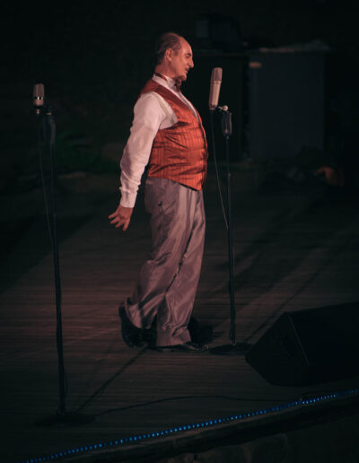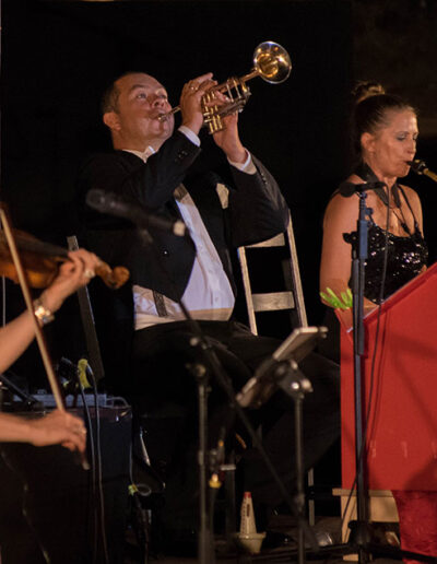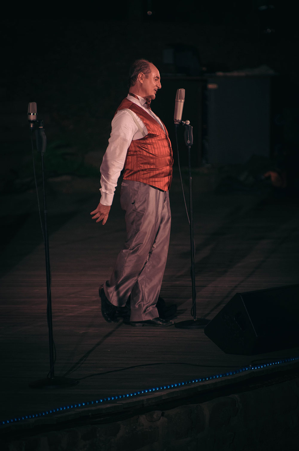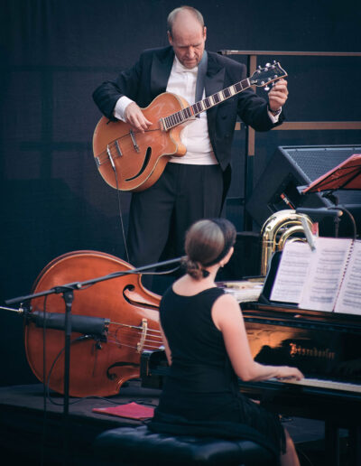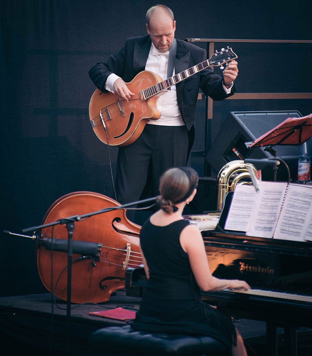 So vielseitig und ein halbes Jahrhundert umspannend Grothes Musik ist, so vielseitig gehen Paul Holzmann und seine Begleitkapelle an die Sache heran. Charmant wird zum Tanz geladen, verführt, gewitzelt – und gestritten. Um den Platz am Mikrofon und um das Privileg, die erste Geige spielen zu dürfen.
