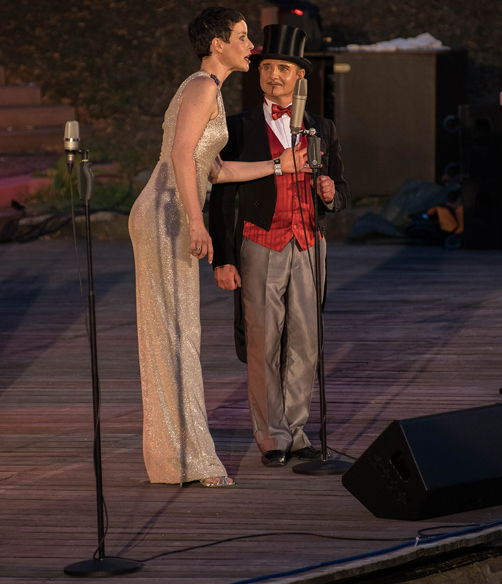 Optisch liegen die Dinge schon anders: Die bildhübsche, gertenschlanke und langbeinige Brünette spielt nicht nur instrumental die erste Geige. Er hingegen ist um eine gute Haupteslänge kürzer geraten und kompensiert durch pures Selbstbewusstsein. Das kann er sich auch leisten, denn wenn er mit schmelzendem Bariton Franz Grothes frech-frivolen Schlager intoniert, dann schwelgt das Publikum. […]