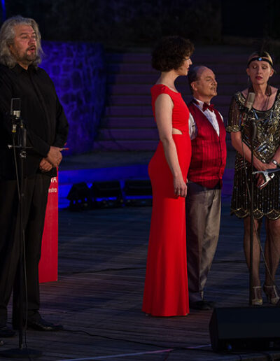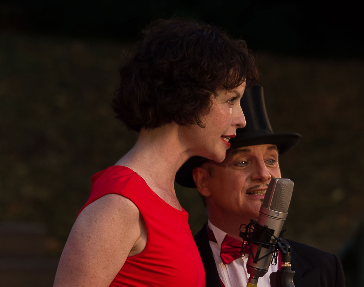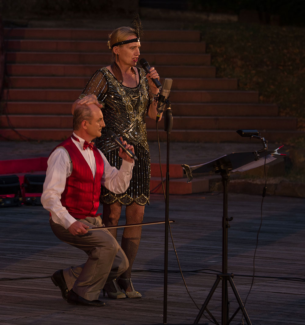 Andreas Holzmann und seinem Ensemble war es ein Anliegen, hinter dem verdunkelten Himmel der NS-Zeit die Stars wieder ans Licht zu bringen. Die Darbietung beeindruckte durch hohe Sangeskunst, gepaart mit bezauberndem Flair. Neben den glamourösen Sängerinnen Sonja Firker und Ina Brox begleiteten vier Musiker den Conférencier Holzmann durch die musikalische Zeitreise. Nach zweieinhalb Stunden Showprogramm spielte das Orchester als Zugabe „Mein kleiner grüner Kaktus“. Das animierte nicht nur die Gäste zum Trällern.